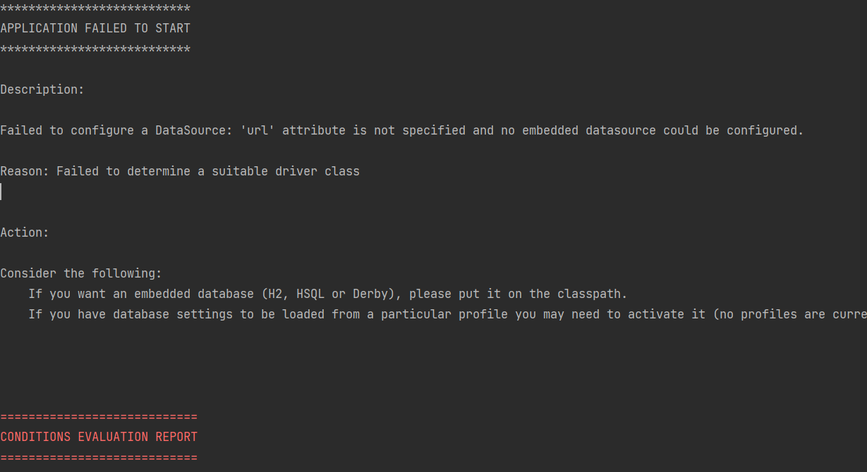 Description: Failed to configure a DataSource: 'url' attribute is not specified and no embedded datasource could be configured.