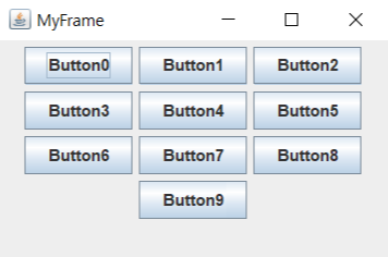 1번 문제를 참고하여 GridLayout을 사용하여 다음과 같은 화면이 나오게끔 프로그램을 작성하라.